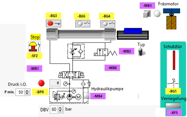 Lösung mit GRAFCET: Der Hydraulikplan ist nur ein Bild. Das Programm kommuniziert mit dem virt. Modell.