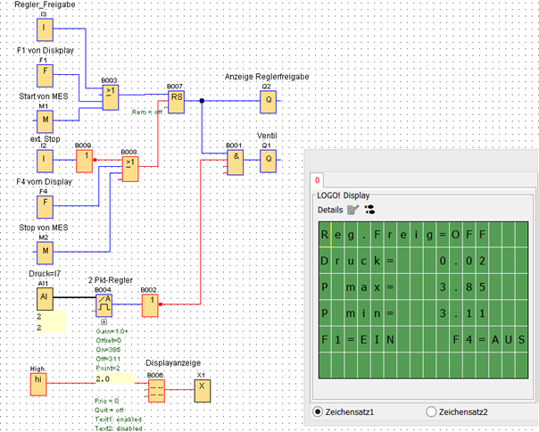 Bei dieser einfachen Anordnung wird mit einem 3/2WV mit anschließendem Rückschlagventil der Druck im Druckbehälter geregelt. Bei großen Druckbehältern kann die Drossel vor dem Druckbehälter entfallen. Der Drucksensor -BP1 hat folgendes Signal: 0...10bar -> 0...10 V Spannung. Der Analog-Eingang der LOGO!8 löst die Eingangsspannung 0...10V in eine U16 Word von 0...1000 auf