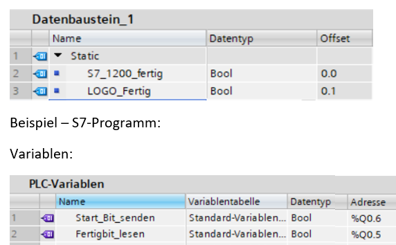 | Die Steuerung S7 1200 und die LOGO!8 werden vernetztBeispiel: Die Steuerung S7 1200 beinhalte eine Zuführeinheit. Die Steuerung soll nun ein Start-Bit an eine LOGO!8 senden, damit diese einen Arbeitsvorgang ausführt. Nun soll die LOGO!8 eine Fertigmeldung an die S7 1200 (Bit) senden. Die Kommunikation im S7 1200 Programm läuft über einen DB1.